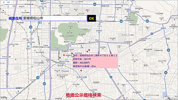 入力した住所近辺に地価の公示価格が指定されている場合は、最大で10件までのピンがその場所に表示されます。