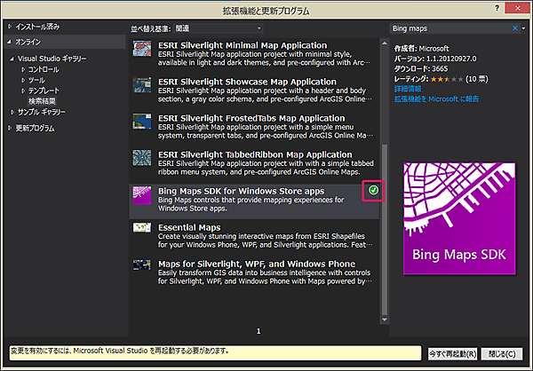 「拡張機能と更新プログラム」から「Bing Maps SDK for Windows store apps」のインストール