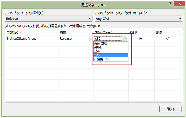 「プラットフォーム」がAny CPUになっていますので、プルダウンメニューから、該当するプラットフォームを選択します。筆者の環境では×86を選択する必要がありました(図8)。