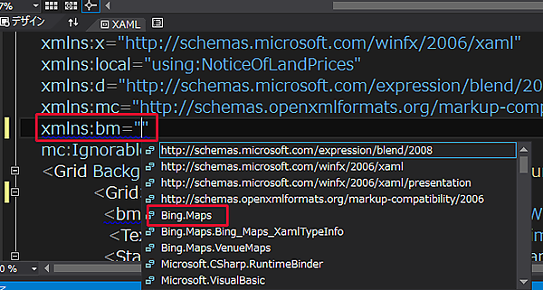 xmlns:bm=”Using:と入力すると値の一覧が表示されますので、Bing.Mapsを選択します(図9)。bm:Mapコントロールを配置します。Bing.Mapsの地図が表示されるはずです、もし地図が表示されない場合は、一度VS2012を再起動してください。