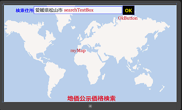 <TextBoxx:Name="searchTextBox" BorderBrush="Blue" FontFamily="Meiryo UI" FontSize="36" Height="60" Width="700" Margin="0,9,0,11" Text="愛媛県松山市" />■(4)