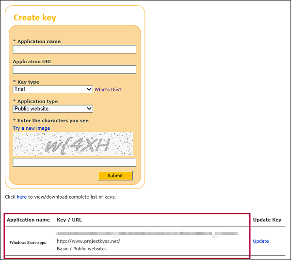 Create keyの画面が表示されますので、必要な項目を入力してSubmitしてください。筆者はすでにキーを持っていますので、下記にキーが表示されています(図13)。Key typeはBasicとなっています。