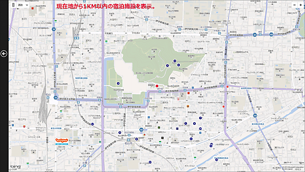 <TextBlock x:Name="TitleTextBlock" HorizontalAlignment="Center" Height="49" Margin="67,14,0,0" TextWrapping="Wrap" Text="現在地から1KM以内の宿泊施設を表示。" VerticalAlignment="Top" Width="1279" FontFamily="Meiryo UI" Foreground="Crimson" FontSize="36" FontWeight="Bold"/>(3)