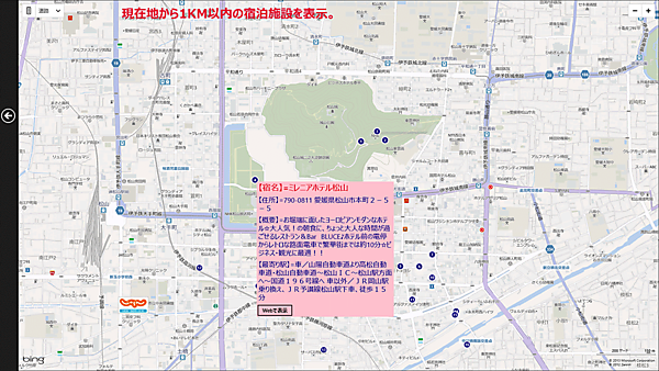 起動すると自分の現在いる位置(赤い●)と、1Km範囲内にある宿が、最大で20か所表示されます(図1)。宿の位置には紺色の●が表示され、●をタップすると、宿の「住所」、「概要」、「最寄り駅」の情報が表示されます(図2)。「Webで表示」ボタンをタップすると、その宿に関する情報がブラウザで表示されます(図3)。