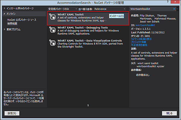 今回はCodePlexで公開されている、WinRT XAML Toolkitに含まれているコントロールを使用します。WinRT XAML Toolkitについては下記のURLを参照してください。この原稿執筆時点でのバージョンは1.3.5となっていますが、現在のバージョンは1.3.6 です。