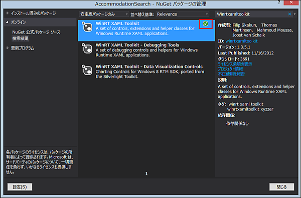 [閉じる]ボタンをクリックして画面を閉じます。ソリューションエクスプローラー内の「参照設定」を見るとWinRTXAMLToolkitが追加されています。同時にWinRTXAMLToolkitの情報が記述された、packages.configも作成されます(図7)。