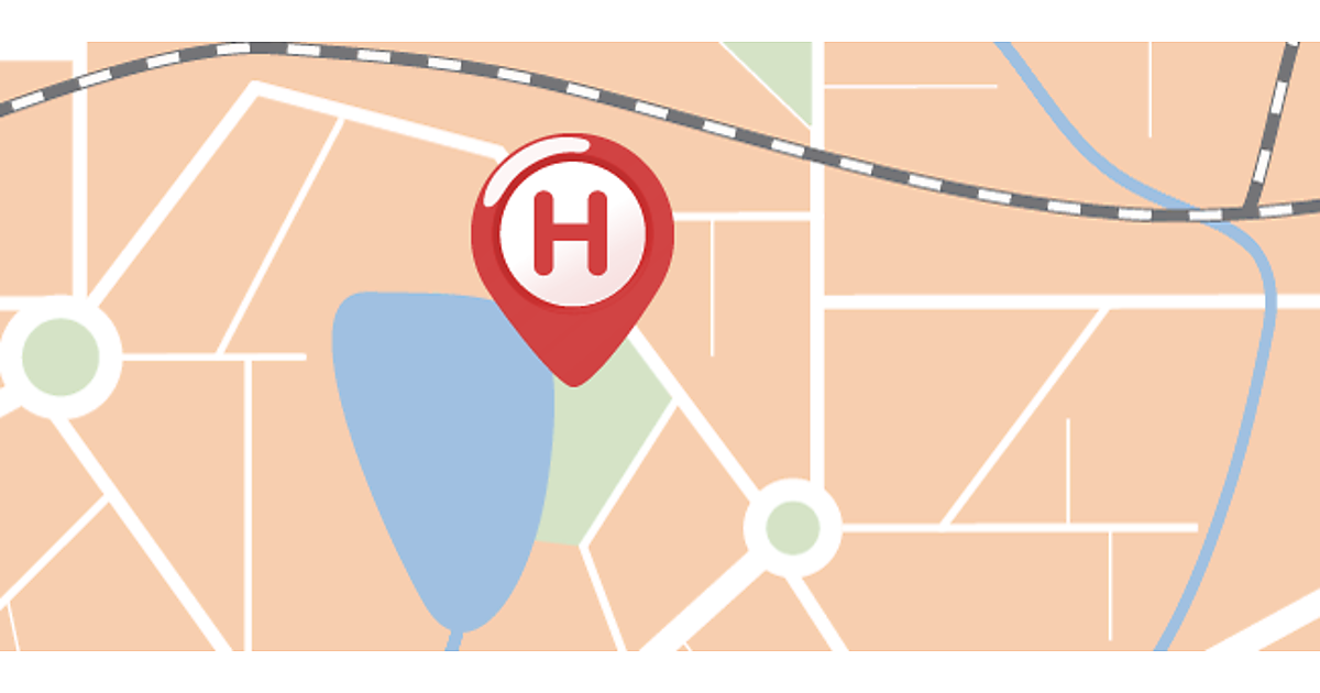 起動すると自分の現在いる位置(赤い●)と、1Km範囲内にある病院が、最大で20か所表示されます(図1)。