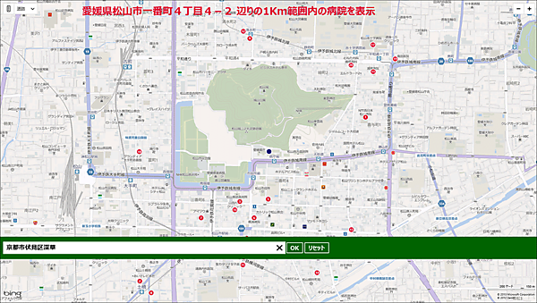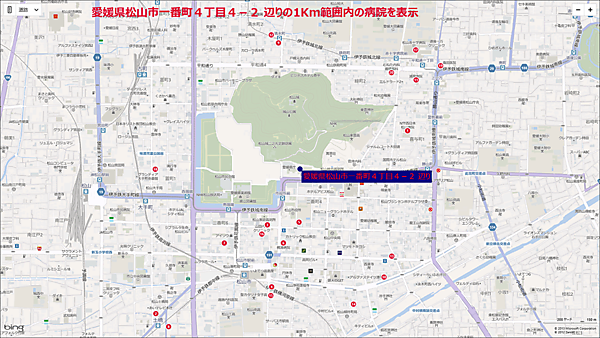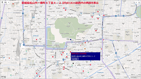 住所を入力して「OK」ボタンをタップすると、その住所から1Km範囲内の病院が表示されます(図5)。