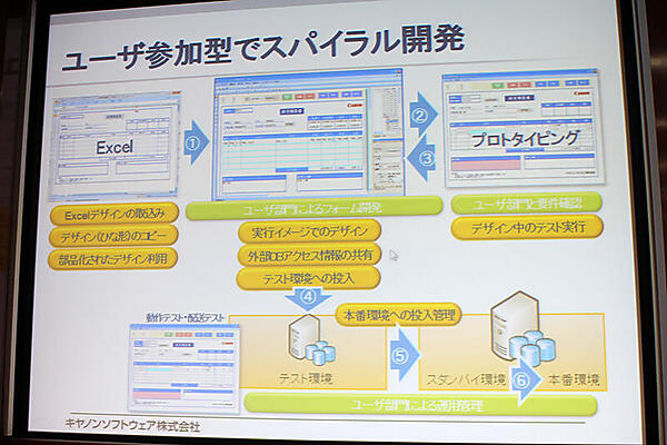 情報システム部の鈴木英文氏は、ユーザー部門のメンバーと共に3日間のトレーニングを受けたものの開発が難航し、キヤノンソフトウェアのユーザーサポートにアドバイスを受けながらユーザー部門(総務課、人事課、勤労課)の担当者が1人1申請書を作成、完成することができた。こうしたサポート体制も重要な要素だ。