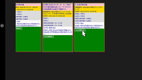 サンプルアプリを実行すると、都道府県の一覧が表示されます(図1)。任意の都道府県を選択すると、その地域で開催されているパーティ情報の一覧がタイルで表示されます(図2)。任意のタイルをタップすると、そのパーティの詳細データがWebBrowser内に表示されます(図3)。
