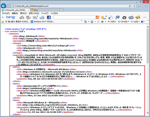 で表示されるブラウザの画面で、マウスの右クリックで表示されるメニューから「ソースの表示」でソースを表示させ、拡張子を.xmlで書き出し、ブラウザで表示すると図6のようなXMLを返します。このXMLの赤で囲った要素を取りだします。