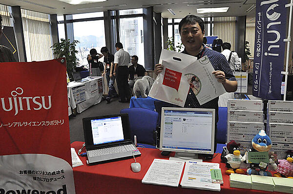 富士通SSLのブースでは、同社が提供する「OSSミドルウェアサポート・サービス」を中心に、遠隔地へのバックアップサービスやデータベースコストを削減するためのソリューションなどを紹介していました。