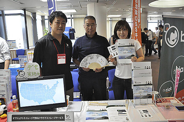 東京エレクトロンデバイスとパートナーシップを結ぶ、Bashoの分散KVSであるRiakと、Amazon S3 API互換のクラウドストレージRiak CSの動作デモを紹介。ロゴの入ったおしゃれなステッカーや扇子を配布していました。