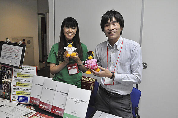 LPIではLinux技術者認定試験(LPIC)を紹介。試験学習用の認定書籍が多数展示されていました。マスコットのLPIC君、LPICちゃんも一緒に。