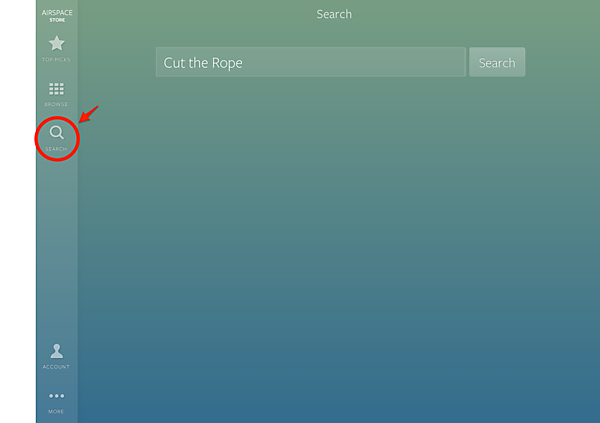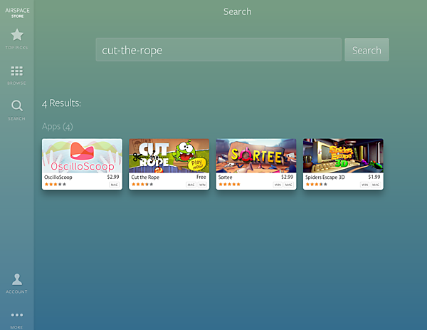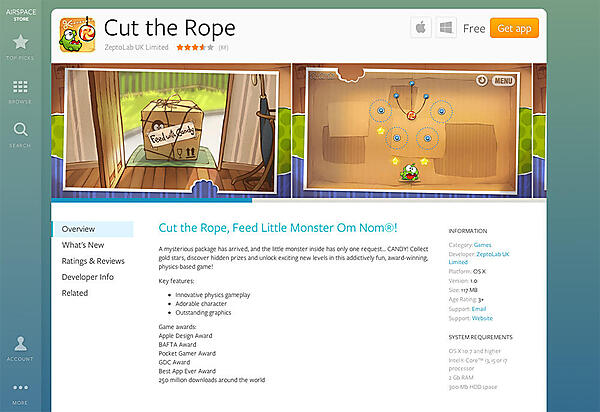 せっかくなので他のアプリをダウンロードして遊んでみましょう。左上のAirspace Storeをクリックすると、Webブラウザが起動し、Airspace Storeのページが開きます。ここでは筆者の好きなゲームであるCut the Ropeをダウンロードします。