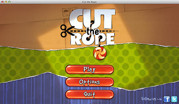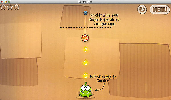 Cut the Ropeがダウンロードできたので起動してみます。起動すると、いつもの音楽と共に全画面でゲームが立ち上がります。メニューを選択するには、メニューの上でカーソルを一定時間止めて下さい。カーソルの色が緑色に溜まっていき、満タンになると次の画面に移ります。