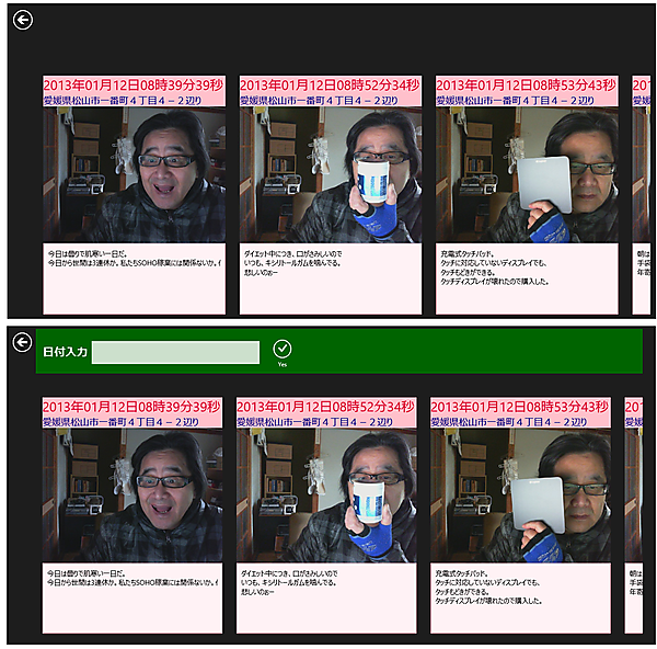 「Folder」アイコンでは、保存した写真とコメントの一覧を表示して閲覧することができます(図7)。