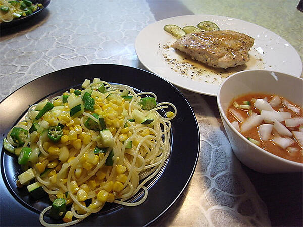 夏野菜は、キュウリ、ナス、トマト、ピーマン、オクラ、トウモロコシ、ズッキーニなどが代表的です。今回はこれら旬の夏野菜をたくさん使った料理を紹介します。前菜は、スペインの冷たいスープ ガスパチョ、パスタは夏野菜のペペロンチーノ、そしてメインは鶏胸肉のソテー・レモンソースです。