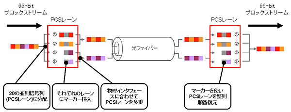 前述のように、MACフレームは10Gイーサネットも100Gイーサネットでも同じ、さらには64B/66Bで符号変換されるところまでは同じです。その後100Gイーサネットでは点滅の回数を増やさないまたは最小限にできるよう、複数のレーンに分割して伝送する方式がとられています。