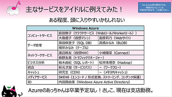 この1年のコミュニティイベントとアップデート情報を振り返りながら、2012年のGoAzure女子部セッション枠での1コマを披露。各サービスをなんとAKB48になぞらえてプレゼンするというユニークなセッション。これは女子部メンバーにしかできません。
