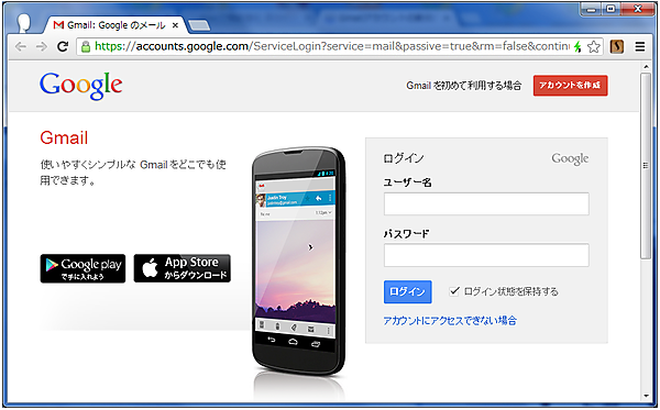 URL:http://mail.google.com/mail?hl=ja をアクセスして下記画面を表示します。