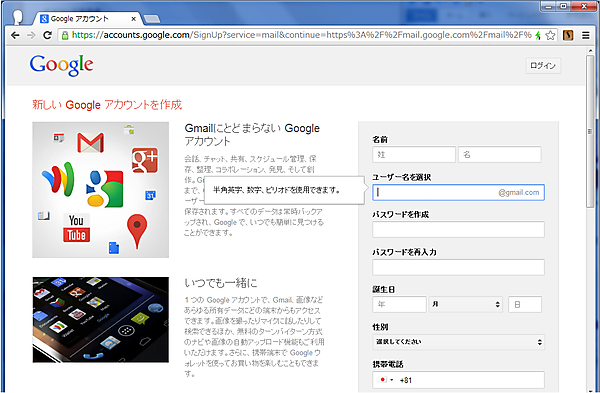 図3の画面で、右上赤枠の「アカウントを作成」をクリックすると、下記図4の画面が表示されるので、この画面から必要項目を入力してアカウントを作成します。アカウント作成ではユーザー名にGmailアドレスを指定してしてメールアカウントも取得します。