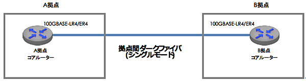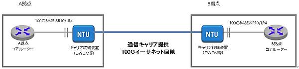 2つ目の手段としては、拠点間の伝送路は通信キャリアの100Gイーサネットサービスを利用し、各拠点のキャリア終端装置(NTU)と100G対応ルーターを100GBASE-SR10で構内接続(構内距離=100m以内)する方式です。 この場合拠点間の品質は通信キャリアによって設置された伝送装置等により確保されるため、100Gイーサネット回線の導入を検討しているユーザーにとってはハードルが低い方式であるともいます(下図5参照)。