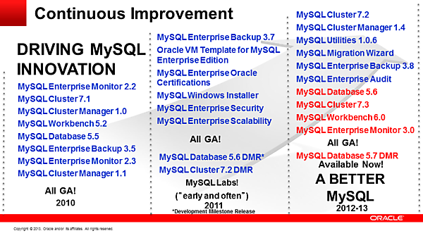図1は、オラクルに買収された以降にリリースされたMySQL関連の製品群の一覧です。MySQLサーバー本体は、2010年にMySQL 5.5、2013年にMySQL 5.6と、2度メジャーバージョンアップしています。また、共有ディスクを使わずにアクティブ-アクティブのクラスタ構成を組めるMySQL Clusterは、2010年にMySQL Cluster7.1、2012年にMySQL Cluster 7.2、2013年にMySQL Cluster 7.3と、3度のメジャーバージョンアップを重ねています。それ以外にも、運用管理ツールであるMySQL Enterprise Monitor、バックアップツールであるMySQL Enterprise Backup、MySQLサーバーの統合開発環境であるMySQL Workbenchなどなど、数多くの製品がリリースされています。