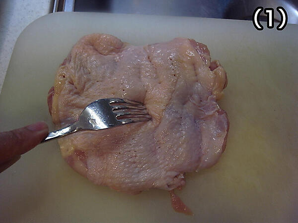 - 鶏もも肉の皮目からフォークをぶすぶすとさして、筋切りとともに、ソースの絡みをよくします。これがすんだら、塩・コショウで下味をつけます。