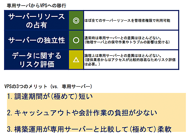 以上のように、現在利用している専用サーバーを利用し続けるかVPSに移行するかは、物理サーバーではないことについてどうリスク評価するかによって決まるでしょう。