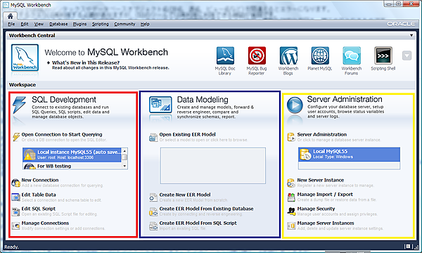 しかし以下の起動画面からもわかるように、一つのツールに並列して三つのツールのトップがならべられています。これまで見たようなMySQL Workbenchの成り立ちを知るものにとってはわかりやすく、取っ付きやすいのですが、はじめて利用する人にとっては必ずしもわかりやすいものではありませんでした。