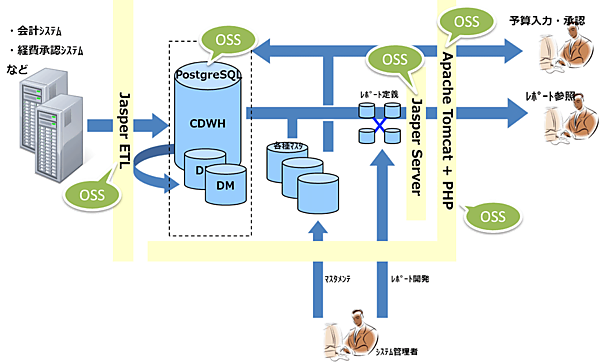 OSSとして公開された「BudgetRunner」は、予算編成機能だけですが、他のOSSを駆使することで、フルオープンソースで予算管理システムを構築することができます。下の図は、筆者の勤務するクロスキャットがSaasとして提供している予算管理サービス「CC-BudgetRunner」の構成図です。