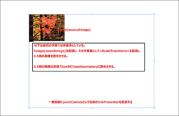 次に、zoomImageというImageコントロールを配置し、WidthとHeightをsourceImageと同じにします。Sourceプロパティにも同じ画像を読み込んでおきます。Canvas.LeftとCanvas.Topも大体、sourceImageに近い値を指定しておきます。最初の状態では、VisibilityにCollpsedを指定して非表示とします。