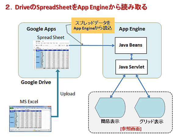 ここで紹介するApp EngineからのSpreadsheet読み取りでは、参照画面のボタンクリックから起動されるサーブレットによってビーンズをインスタンス化し、その中のメソッドによって実行されます(図9)。読み取られたSpreadデータはブラウザに画面表示されますが、今回は簡易形式での画面表示を紹介し、次回の連載でスプレッドシート風のグリッド表示について紹介します。