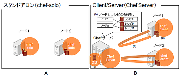 Chefのアーキテクチャは、大きく分けて2つのタイプがあります。1つ目が、単体プログラム(スタンドアロン)で使用するタイプ(図3-A)、2つ目がClient/Server構成で使用するタイプ(図3-B)です。2つのタイプの大きな違いは、レシピを配布・管理する機能の有無です。