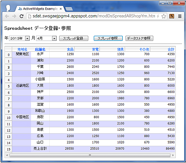次に、ここまで見てきたスプレッドデータのサーバ側処理結果を、ブラウザでUI表示する処理について見ていきますが、最初に画面操作と表示内容を見てみます。