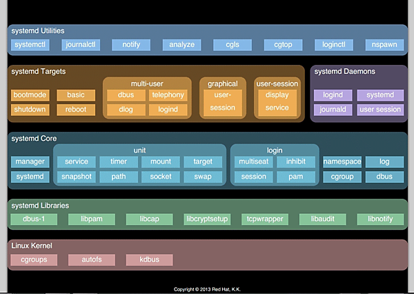 運用管理性の向上としてはsystemdを搭載している。systemd(下図参照)は、多岐にわたる変更をRHEL7にもたらすが、中でもサービス、リソース、ユーザー管理に対して効力を発揮する。さらにsystemdはRHEL7で導入されたリソース管理の枠組みであるCグループと連携することでシステム全体のリソース管理が行われることになる。