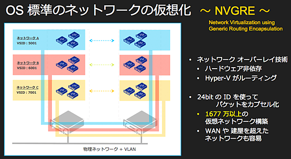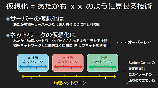 オーバーレイネットワークとも呼ばれるこの仕組みを利用すると、サーバー仮想化の担当者は、物理ネットワークの上で自由に仮想ネットワークを作り、使うことができる。例えば、A社用/B社用/C社用、あるいは開発部用/経営企画部用/プロジェクトxx用といった具合にネットワークを自由に作り、他の仮想ネットワーク上でどのようなIPアドレスが使われているかを意識することなく自由にIPアドレスを設定することが可能である。