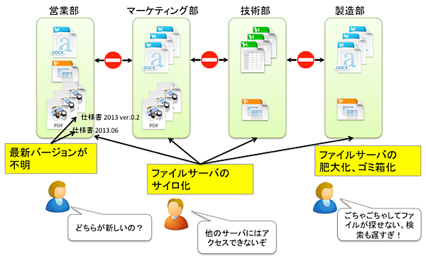 さらに、格納されるコンテンツの量の増加により、ファイルサーバー内に不必要なコンテンツ(ゴミ)が増えてきます。また部署ごとにサーバーが乱立しはじめると、そのサイロ化のために部署を横断するような情報共有が難しくなってきます。