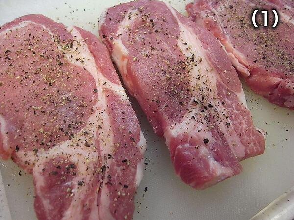 - (1)豚をフォークで筋切りをして、塩・コショウをしたところ。