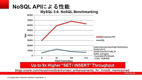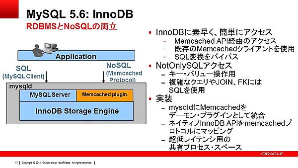 MySQL 5.6では、新たな試みとしてNoSQLのインターフェースを追加しています。InnoDB上のデータにSQLを使わずにアクセスすることも可能になり、SQLを使うよりも高速に処理可能です。NoSQLのインターフェースには、オープンソースの分散キャッシュであるmemcachedを活用し、memcachedをMySQLサーバーのプラグインとして動作できるようにしています。
