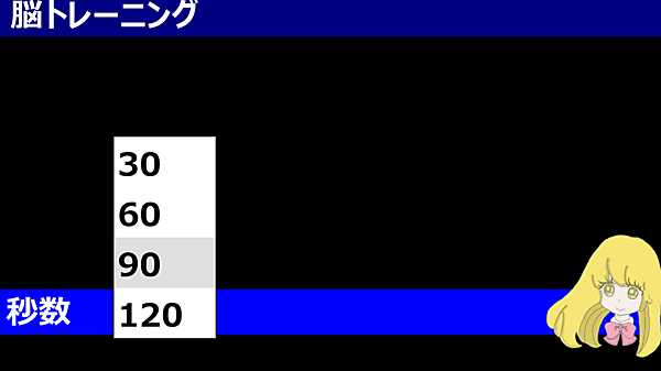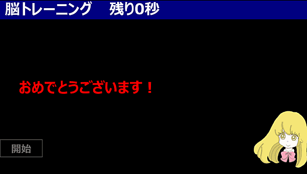 クリアできなかった場合は「残念。時間内にクリアできませんでした。」と喋ります。再度挑戦する場合はマウスの右クリックで表示されるアプリケーションバーから秒数を選択して[開始]ボタンをタップしてください。