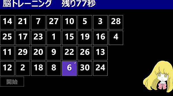 指定した秒数以内に1から30までの数字を順番にタップしていきます。順番を間違えるとエラー音がなります。指定した秒数内にクリアできると、画面上のキャラクターが「おめでとうございます。時間内にクリアできました。」と音声で喋ります(図3)。