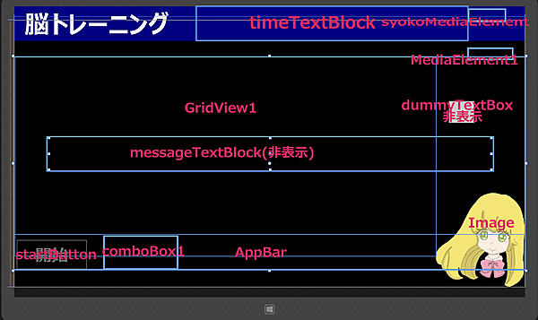 次に経過する秒数を表示するため、「timeTextBlock」という名前のTextBlockを配置します。次に、キャラクターが音声を発生するために必要な、「syokoMediaElement」という名前のMediaElement要素を配置します。
