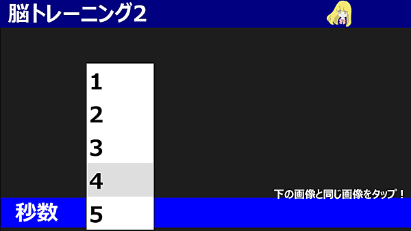 今回は脳トレーニングアプリ第2弾として、制限時間内に指定された絵柄と同じ絵を探すアプリを作ります。操作イメージは次のとおりです。