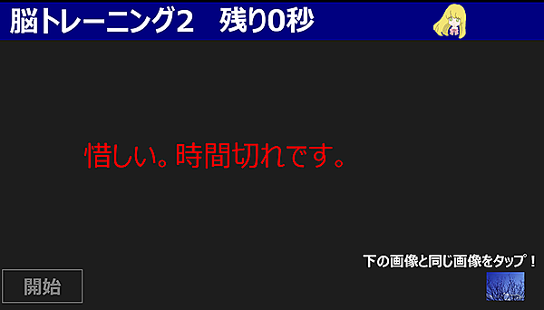 選択した画像はあっていても時間内にクリアできなかった場合は「惜しい。時間切れです。」と喋ります。不正解の場合は「残念。不正解です。」と喋ります。