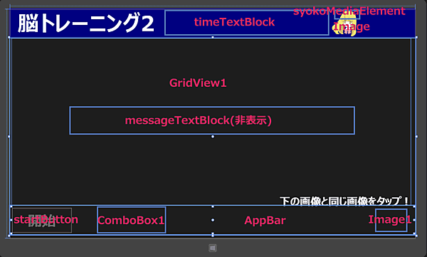 (8)「下の画像と同じ画像をタップ!」と表示させるTextBlock要素を配置します。