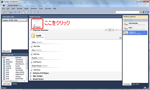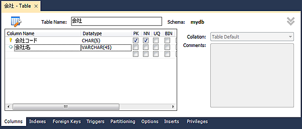 今回の記事の操作はmydbというスキーマ(データベース)に行われます。接続先のMySQLサーバーに作成(フォワードエンジニアリングやシンクロナイゼーション時)されますので、ご注意ください。