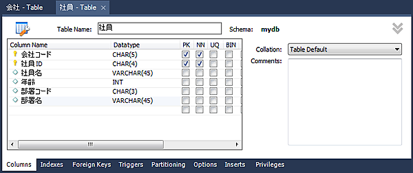 1つ目と同様の手順にて「社員」テーブルを作成します。図3.のように入力してください。Datatypeはコンボボックスから選ぶことも可能です。長さを伴わないものはそのまま、長さを伴うものは長さ指定のところにカーソルがある状態で選択されます。例えばVARCHAR()のように選択して、長さを入力する形になります。