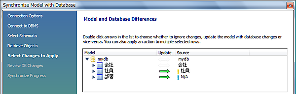 DatabaseメニューからSyncronize Model...を選択し、ウイザードを進めていくとSelect Changes to Applyでモデルと実際のズレが図7.のように表示されます。進めていくとReview DB Changeで実際に発行するDDLが確認できますので、問題ないならそのまま進めてFinishします。